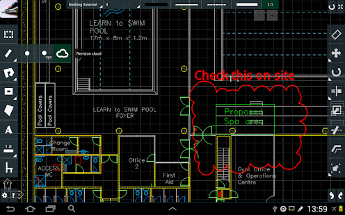 cadTouch supports every DWG (up to AutoCAD™ 2013) entities for viewing and editing as it uses industry-proof input/output DWG importers, and you can draw new lines, polylines, rectangles, circles, arcs, points (also by xyz coords), hatches, texts, smart/angular dimensions, sketches, revision clouds, raster image, ruler, move, rotate, scale, trim, delete, mirror, offset, group, explode, grips, OSNAP, line/patterns type, alignments guides, objects library, preloaded library with 20+ blocks, customizable library, info tool to query length/perimeter/area, layers, black or white background and many more features.